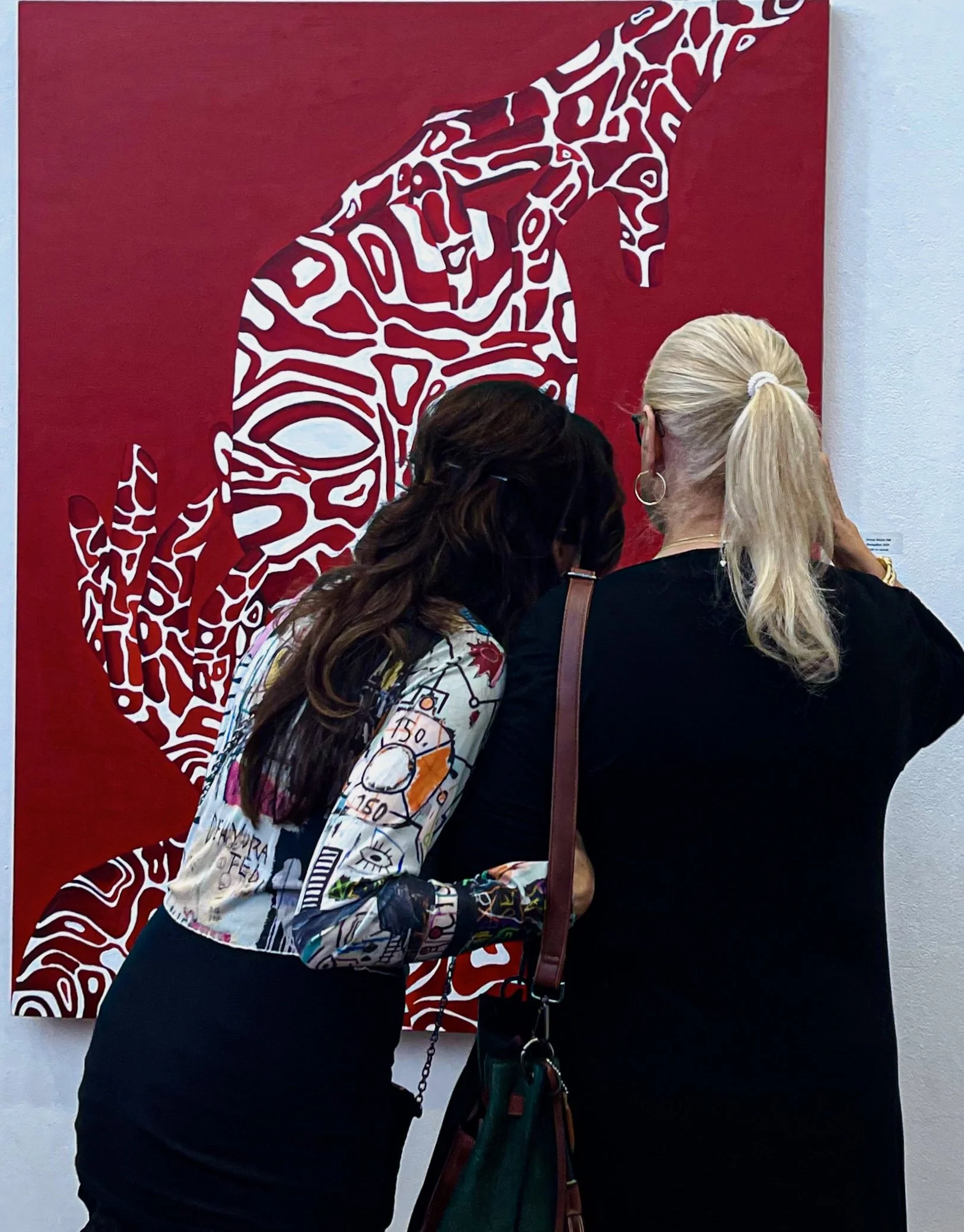 Two women standing in front of modern art featuring an abstract artwork perception by Amaya Selyna, one with dark hair and the other with blonde hair tied back, both closely observing the artwork.